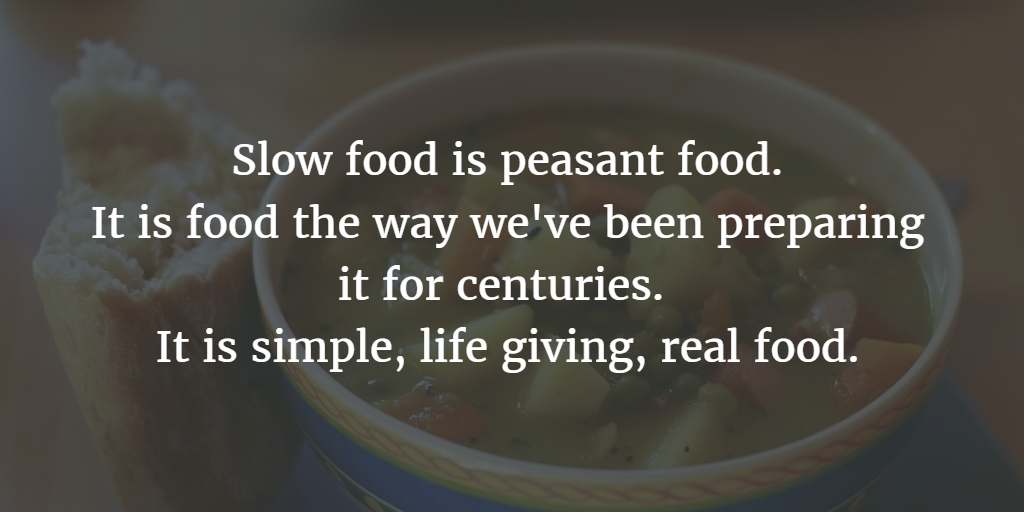 Slow food is peasant food. It is the way our families have been growing and preparing food for centuries. It tastes good, it’s feels clean, and it’s honest. We feel more alive when we eat it.